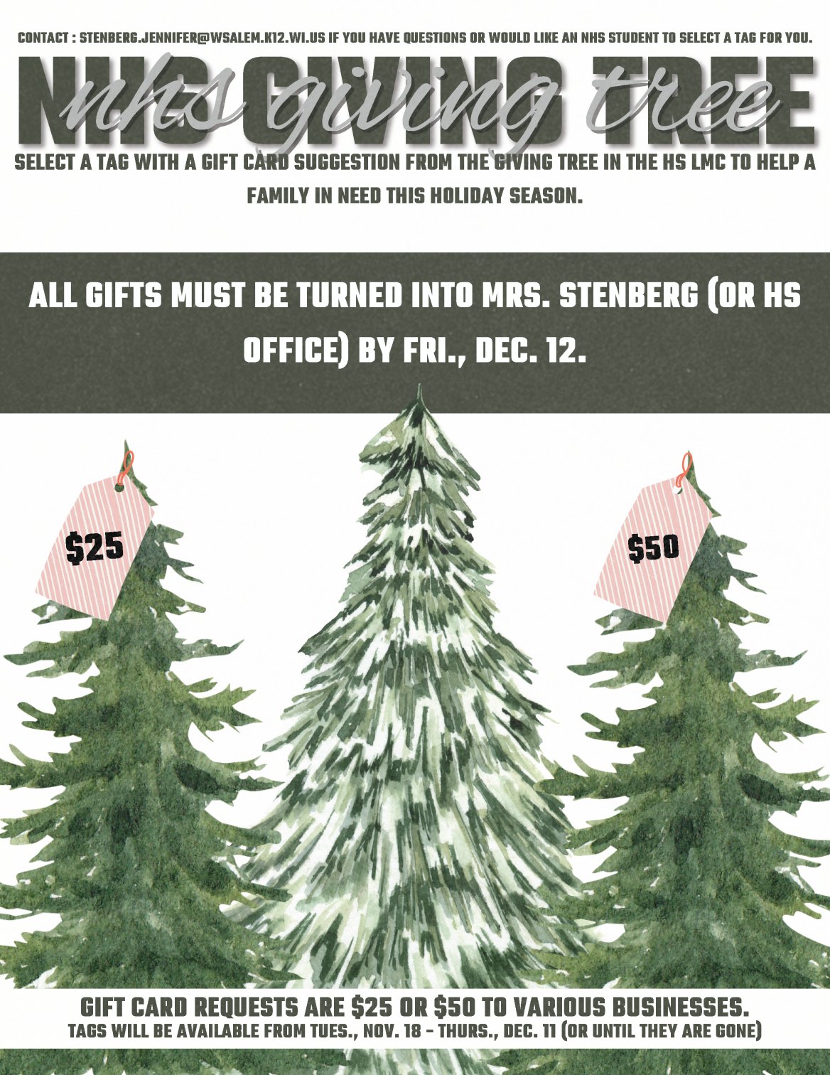 The West Salem High School National Honor Society will once again be sponsoring a Giving Tree for students and families in need this holiday season. The tree has tags that will specify either a $25 or $50 gift card to a specific location. Please contact Jennifer Stenberg at stenberg.jennifer@wsalem.k12.wi.us if you have questions or if you would like an NHS student to select a tag for you.